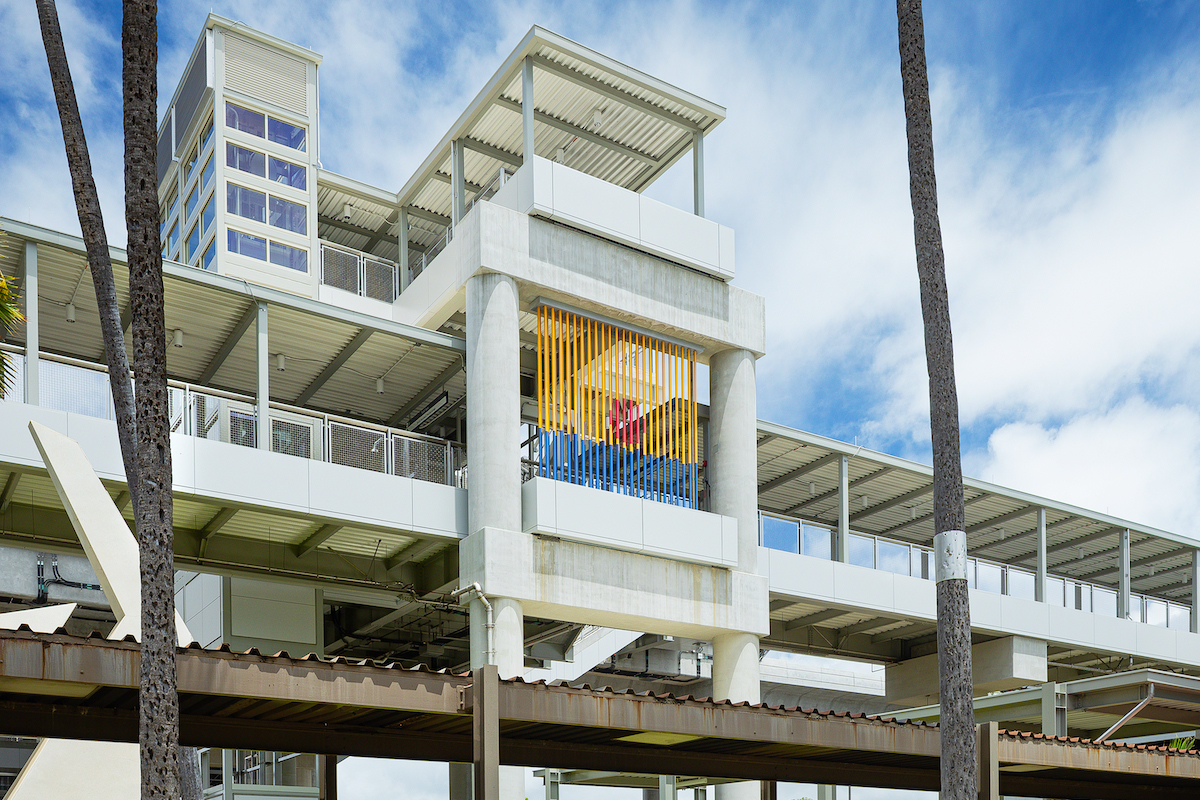 Located along the Nimitz Highway, the elevated station and guideway is located within the highway’s median and resides across the street from Honolulu Harbor.