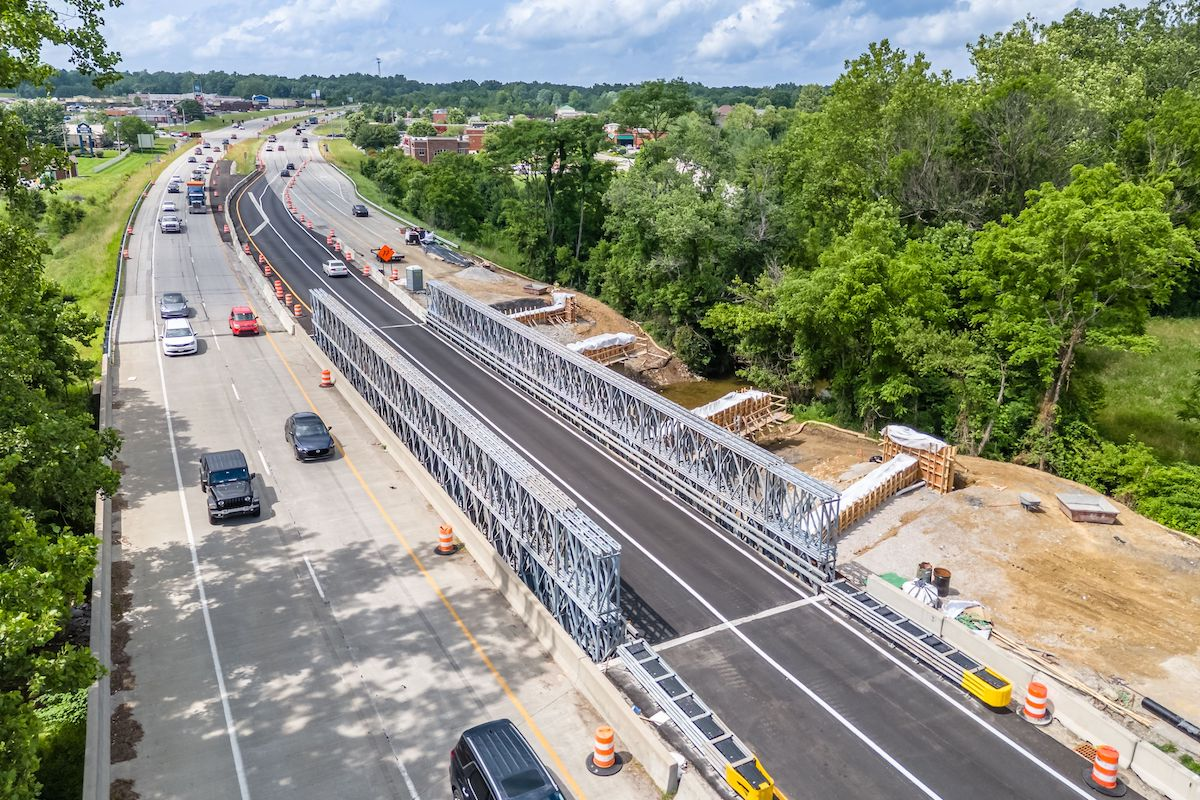 The bridges, which were designated for superstructure reconstruction, are located on Interstate 265 spanning Silver Creek between the cities of New Albany and Clarksville, Indiana, and U.S. Route 150 over Little Indian Creek in the town of Floyds Knobs, Indiana. To improve safety and decrease the duration of the projects, temporary detour bridges from Acrow were selected over phased construction. In addition, using temporary detours would enable full-width construction, eliminating the phase lines that result from sequenced construction.