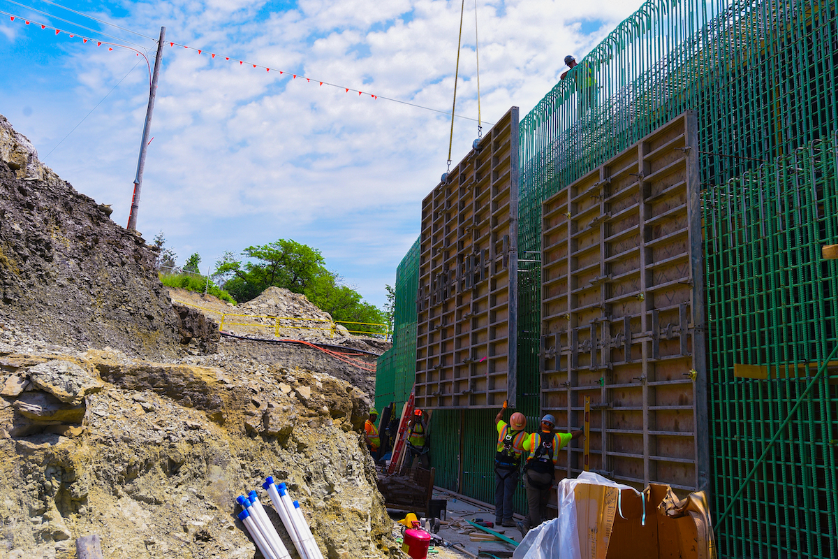 The contract also includes five retaining walls of soldier pile lagging, or cast-in-place concrete panels, which require formwork and rebar handling. Several of the retaining walls are thousands of feet long, extended out to tie into new bridge abutments or wing walls as Business Loop 81 is widened. This is where the Link-Belt TCC-550 and TCC-500 Telecrawlers are busy, when not placing formwork or gangs and rebar at abutments.