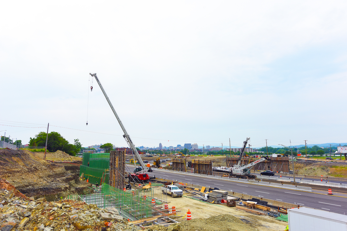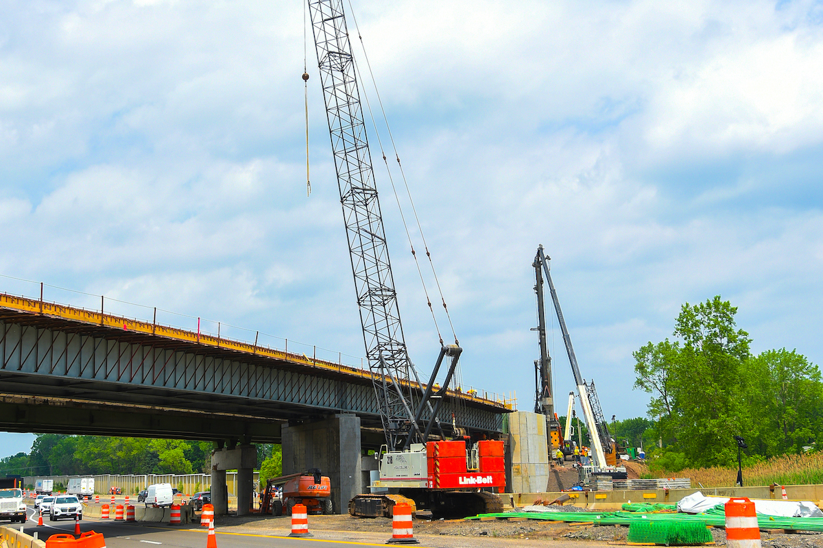 At the demolished Bear Street bridge, several Link-Belt machines are found on both sides of the interstate as well as in the median. The new four-lane (two lanes in each direction) overpass will be lengthened to fit over the expanded Business Loop 81, will be widened for pedestrian traffic, and will have upgraded curb treatments.