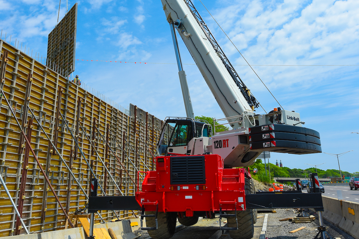 “For the retaining walls, we were using the telecrawlers, always, because you could track along the front of them and pick, carry, and hold the load at a radius of 30 to 40 feet,” Falta added. “They just keep crawling along the path. We also use the crawlers when possible on the abutments because it’s just nice. You don’t have to set up with outriggers and level it out and everything. As long as you have a level path, it works well.”