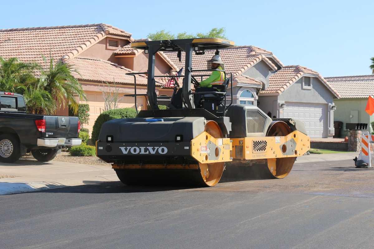 On a recent patching job in a residential neighborhood in Peoria, Primavera deployed a fleet of Volvo compactors, including a DD128, a DD25 diesel-powered asphalt compactor, and a new DD25 Electric asphalt compactor. The project provided an opportunity to compare the electric model against its diesel counterpart.