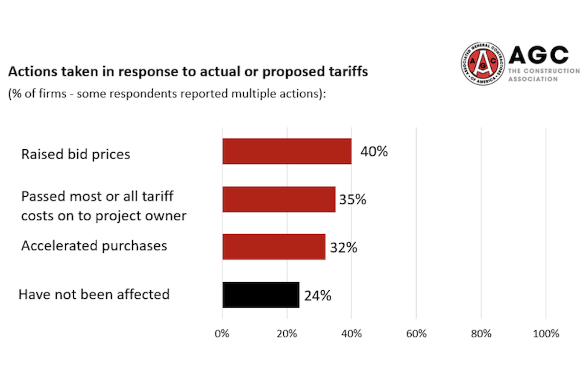 Roughly 70 percent of firms reported being affected by tariffs this year. Forty percent said they responded to actual or proposed tariffs by raising bid prices, and 20 percent of firms added price-sharing adjustments or other terms to contracts. While 35 percent reported passing most or all tariff-related costs on to project owners, 11 percent said they absorbed most or all tariff costs.