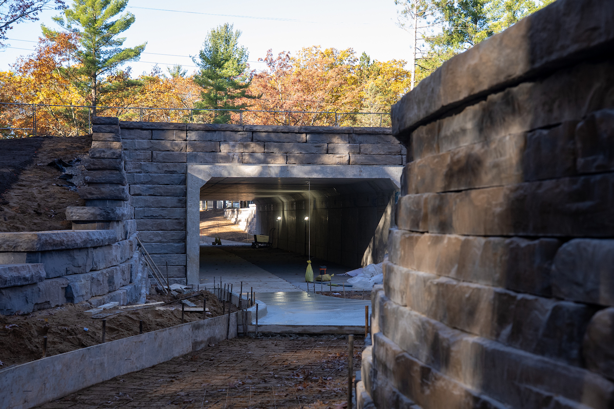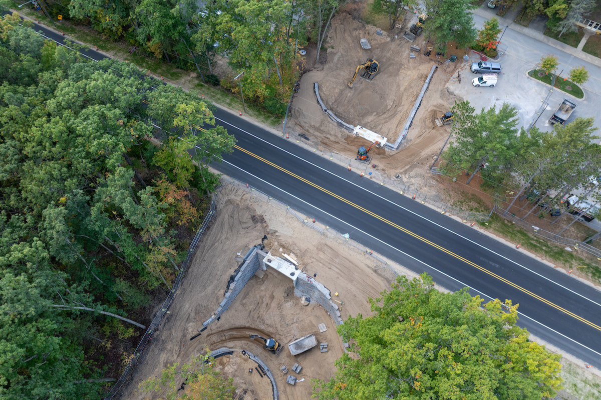 Previously, students, staff, and visitors needed to stop traffic at a crosswalk on J. Maddy Parkway to travel between Interlochen’s Green Lake and Duck Lake campuses. To provide a safer, more connected, and accessible campus, Interlochen explored various options before settling on the box culvert tunnel.
