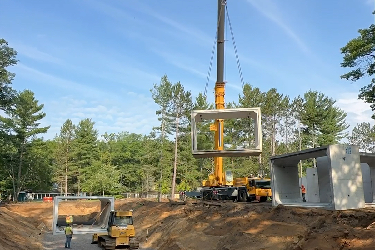 Interlochen Center for the Arts in Green Lake Township, Michigan, connects students of all ages with multidisciplinary arts education, but with its pine-filled grounds nestled between two lakes, only a busy road connected the two parts of campus — until Team Elmer’s of Traverse City, Michigan, constructed a huge box culvert pedestrian tunnel to provide safe access under J. Maddy Parkway in Grand Traverse County.