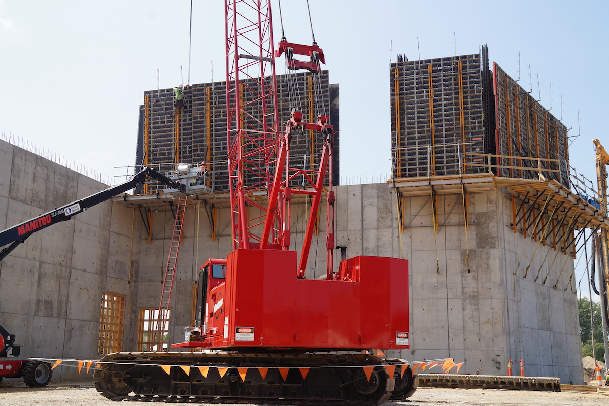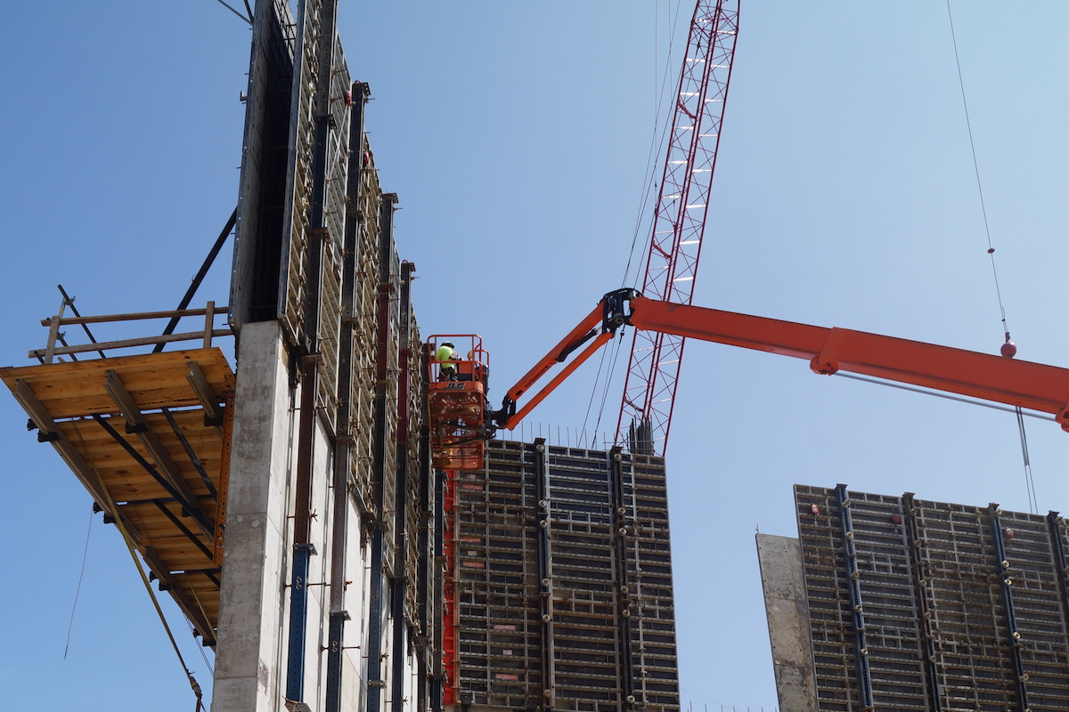 “The formwork had vertical structural members that hung below with set screws that you tighten/loosen to plumb the wall above,” Pung said. “We’d install scaffold that hangs from the wall formwork to secure our work platform.”