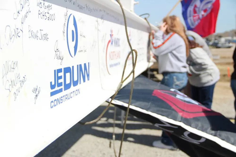 Before the beam was lifted into place, attendees took part in a beam-signing ceremony, adding their names and messages to a steel beam that featured project and partner logos. The signed beam symbolizes the collective commitment of the Platte County School District, sending school districts, project partners, and the community to build a stronger regional workforce pipeline.