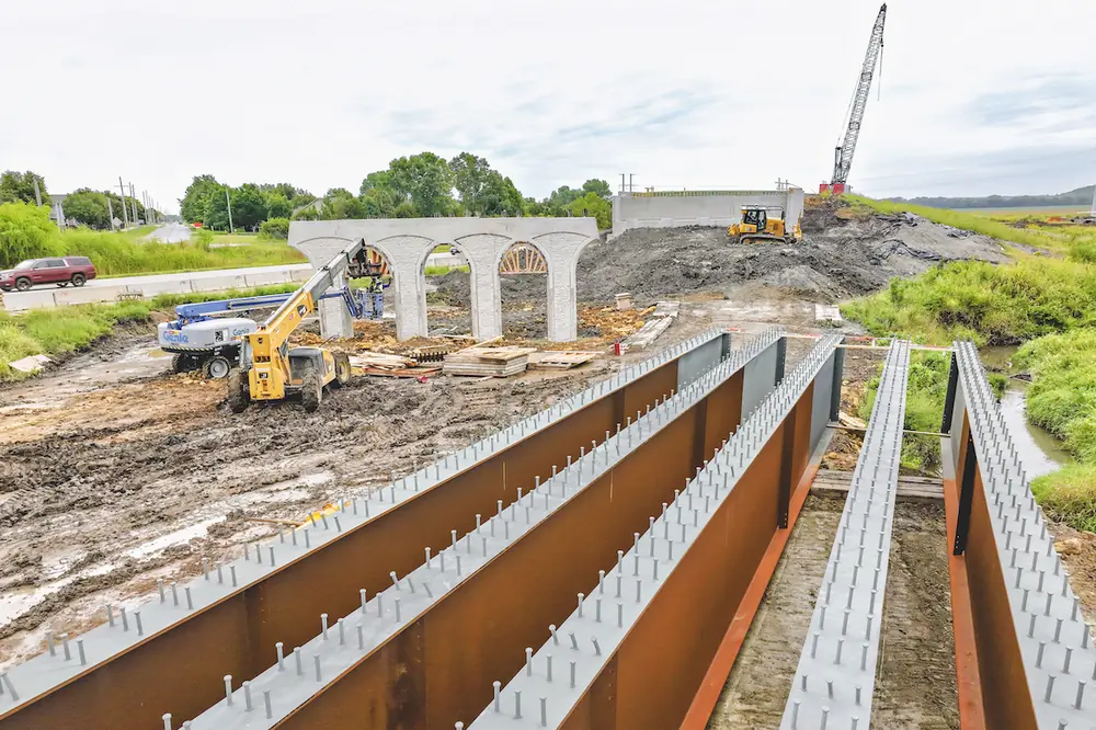 The team is constructing two 800-foot-long new steel girder bridges. The remaining bridges are being rehabilitated.
