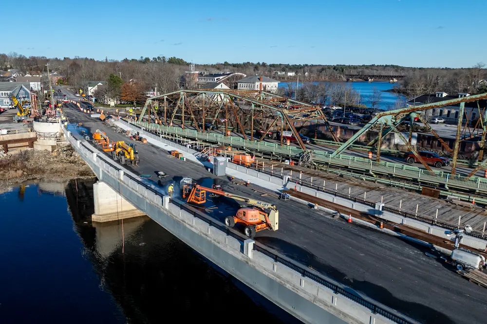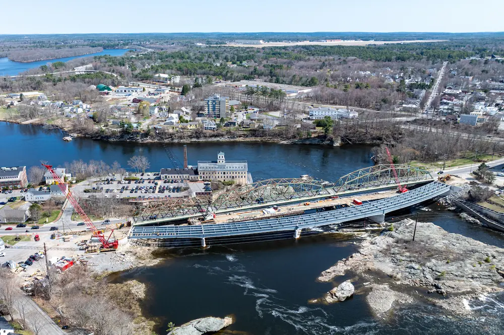 Throughout the project, the Androscoggin River’s erratically shifting depths complicated the new bridge construction. At times, crews had to pause installation of the new bridge’s piers and substructure when the river’s flow became too deep or treacherous. And following intense flooding in December 2023, construction had to stop altogether.
