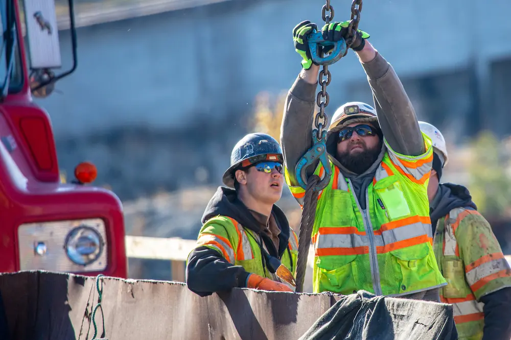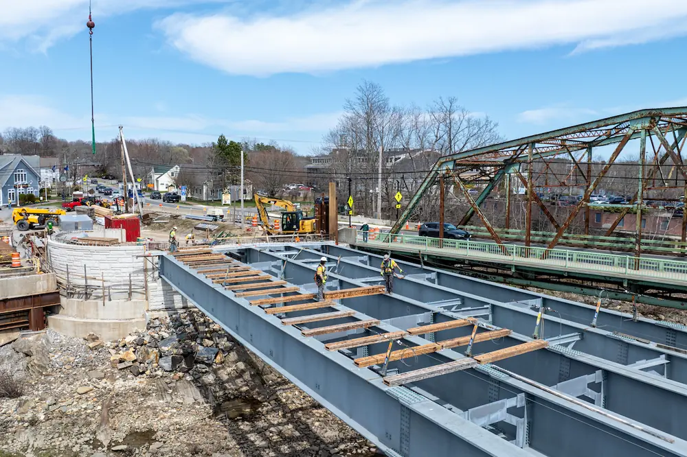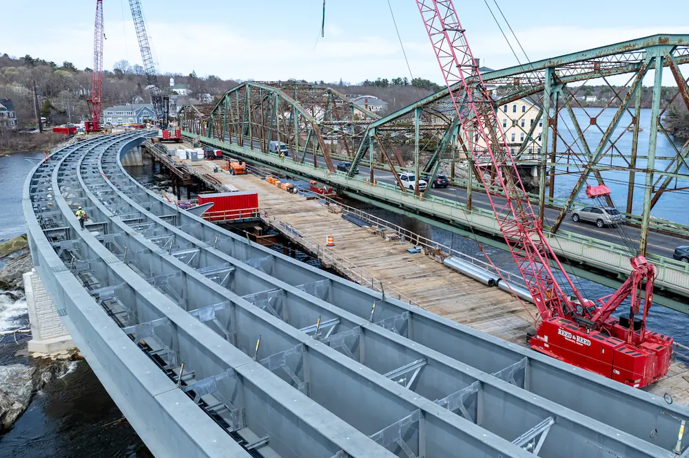 The $50 million project, managed by Reed & Reed in partnership with the Maine Department of Transportation (MaineDOT), officially began in June 2023. Construction on the new bridge — an 815-foot-long, four-span steel plate girder and concrete structure that spans the Androscoggin River — is expected to be completed in late 2026 or early 2027.