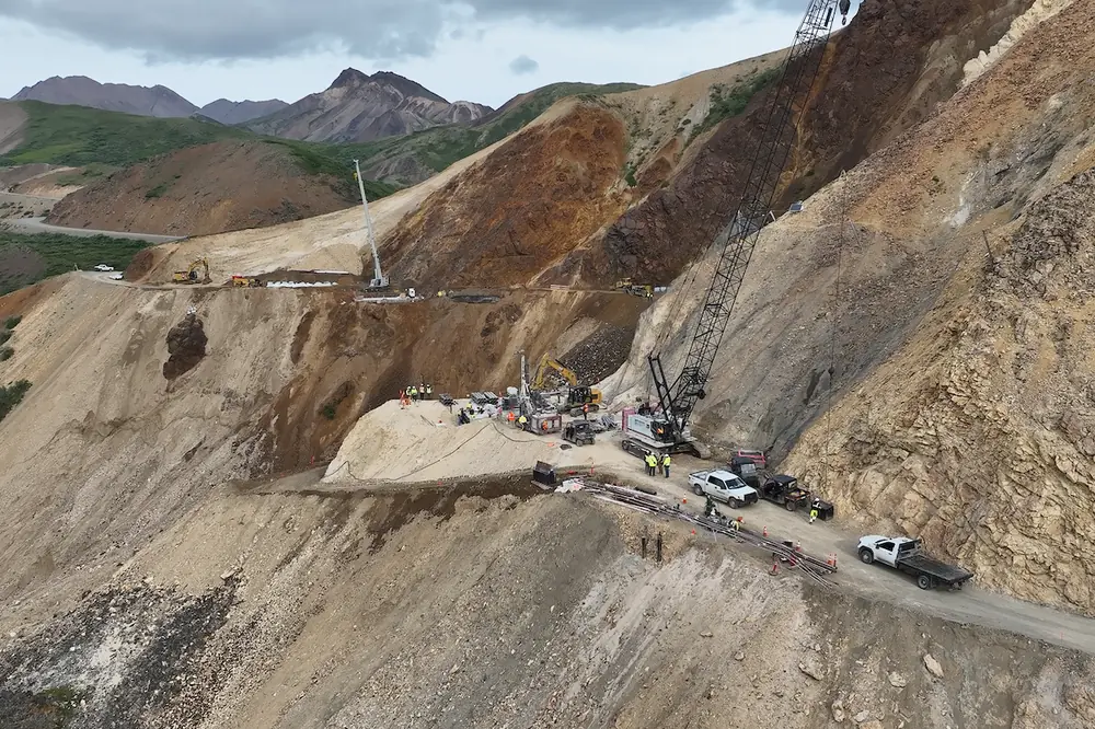The team began to pioneer access, creating the first safe way into the hazardous work zone. They conducted extensive site excavation, including slope cuts and mucking on the unstable west side terrain, as well as drilling and blasting by Advanced Blasting Services (ABS), an Alaska-based drilling and blasting subcontractor.