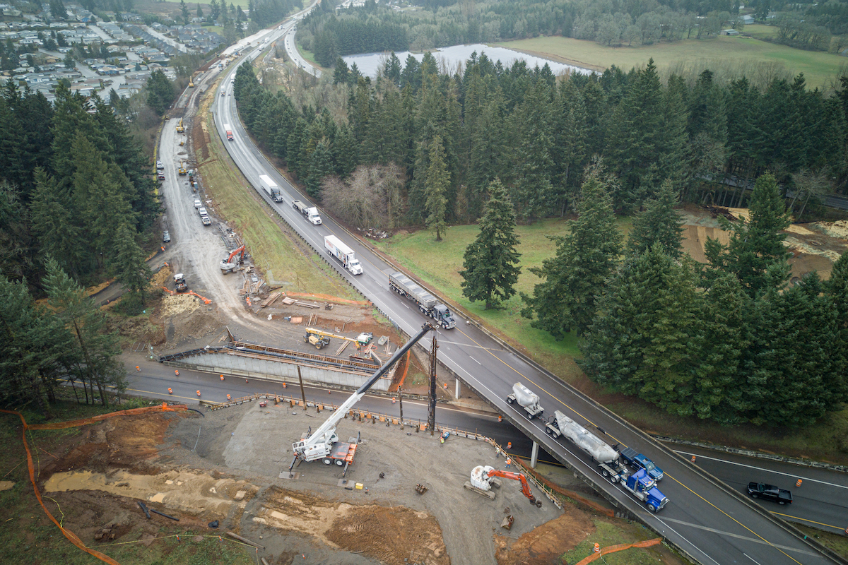 Crews are currently building concrete pile caps that will support 183-foot precast concrete beams — a long single-span structure crossing all lanes of I-5. Once the bridge is complete, crews will tie in the new roadway approaches, which are largely built.