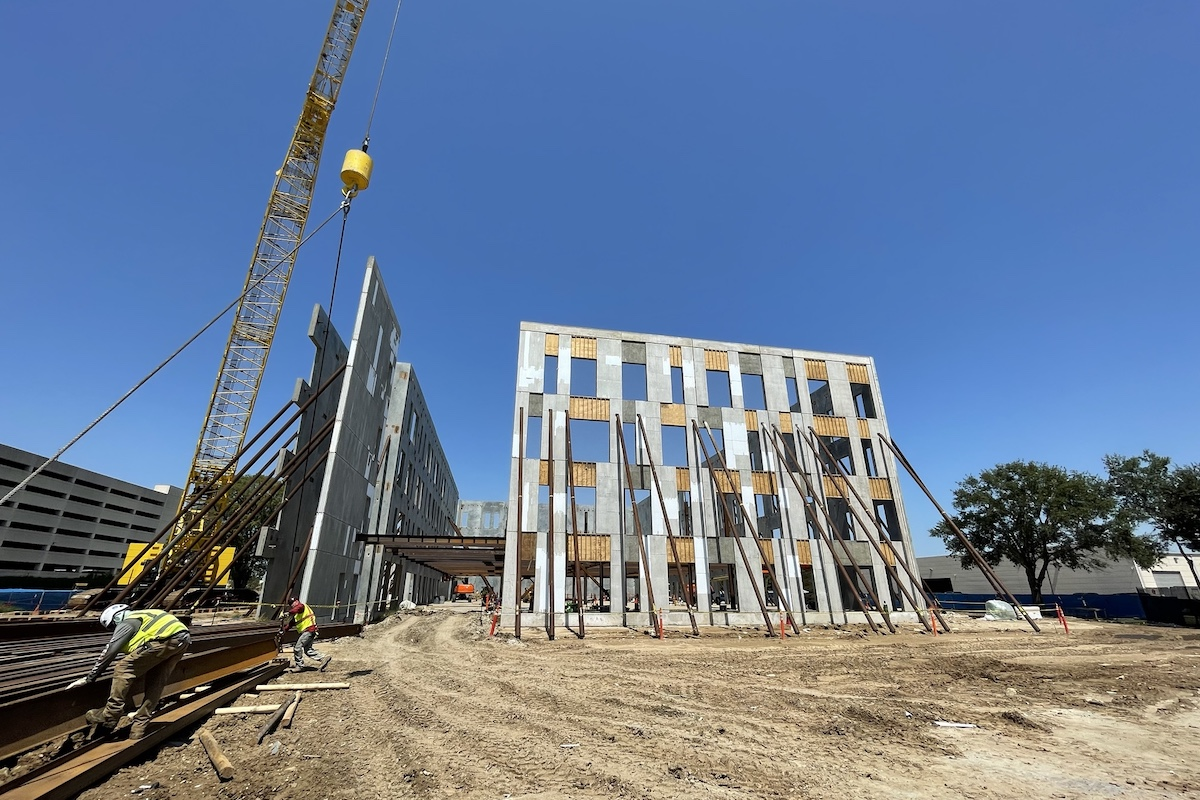 As a final step to the building’s exterior, teams will paint the tilt-wall concrete panels white and install a series of narrow, blue-tinted windows, giving the building a similar look to other buildings in the Harris Health system.