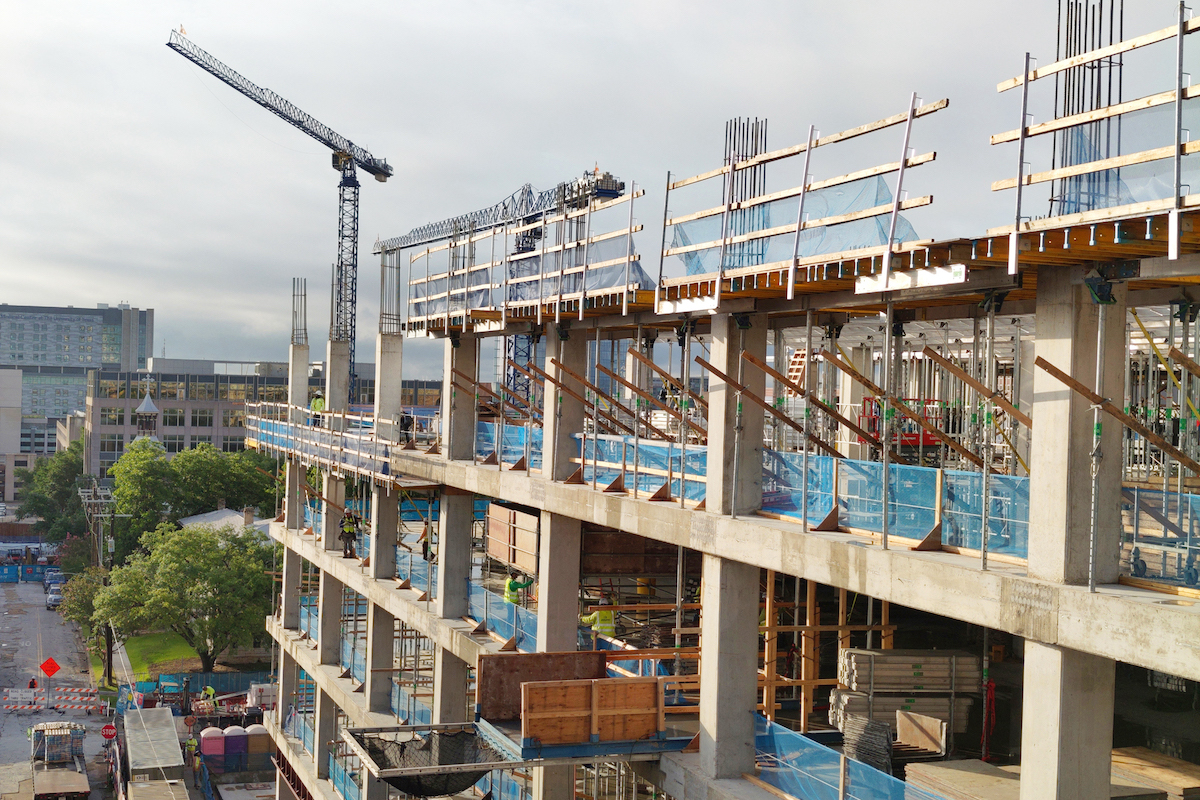 Given the fact that the build sites were relatively confined and surrounded by historic buildings, getting concrete to the right positions required “a pretty extensive system of booms and line pumps that ran from the streets through the structure up to a placing boom,” Emanuel said. “That allowed us to pump the concrete to all of the buildings’ columns and decks.”