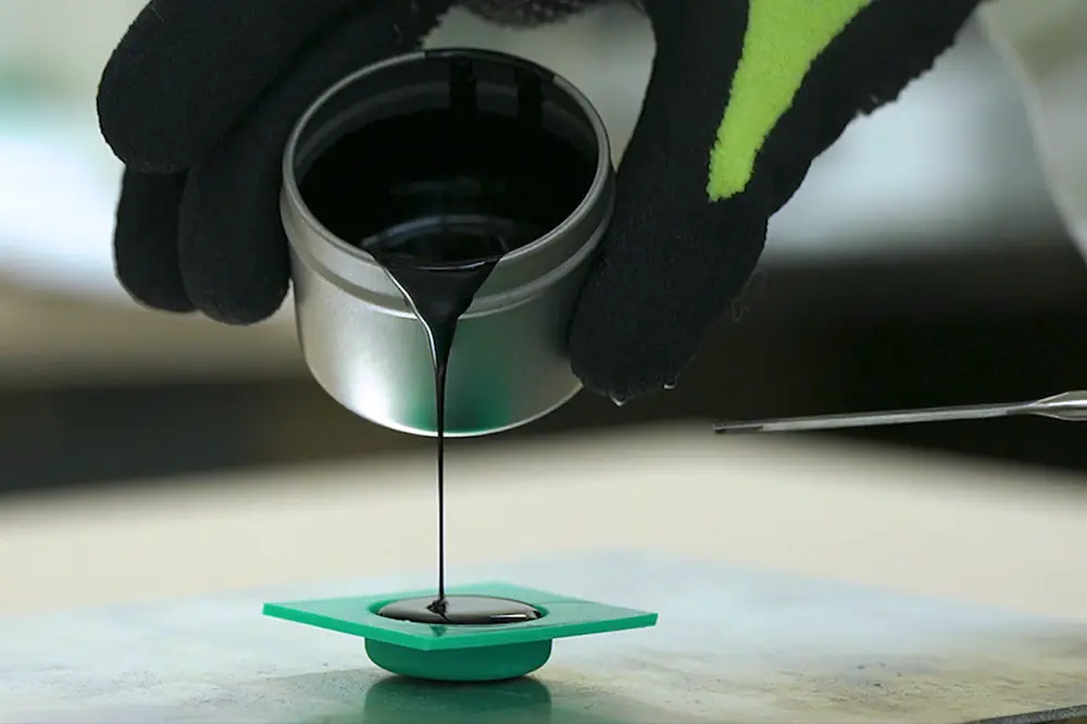 The test, called the “poker chip method,” models the stress that asphalt endures on a roadway to check for cracking in the material. A sample of asphalt binder in the shape and size of a poker chip is sandwiched between two plates and then pulled until the sample cracks, or fails.