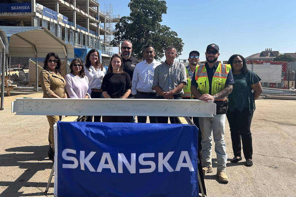 DALLAS, TX — Skanska announces it has reached a significant milestone on the University of North Texas’ (UNT) main campus in Denton, Texas, with the steel topping out of the new Science and Technology Building. To celebrate the topping out, teams signed the steel beam used to top out the structure and erected and placed the final beam.