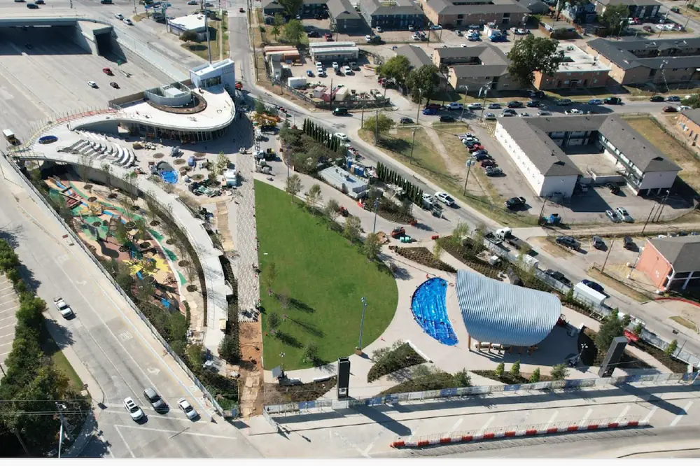 Beyond play areas for children, the park will include a multi-use pavilion that is intended to house food and beverage options as well as host community and other events. This building is approximately 6,000 square feet and includes a rooftop deck with views of the surrounding area and Dallas skyline.