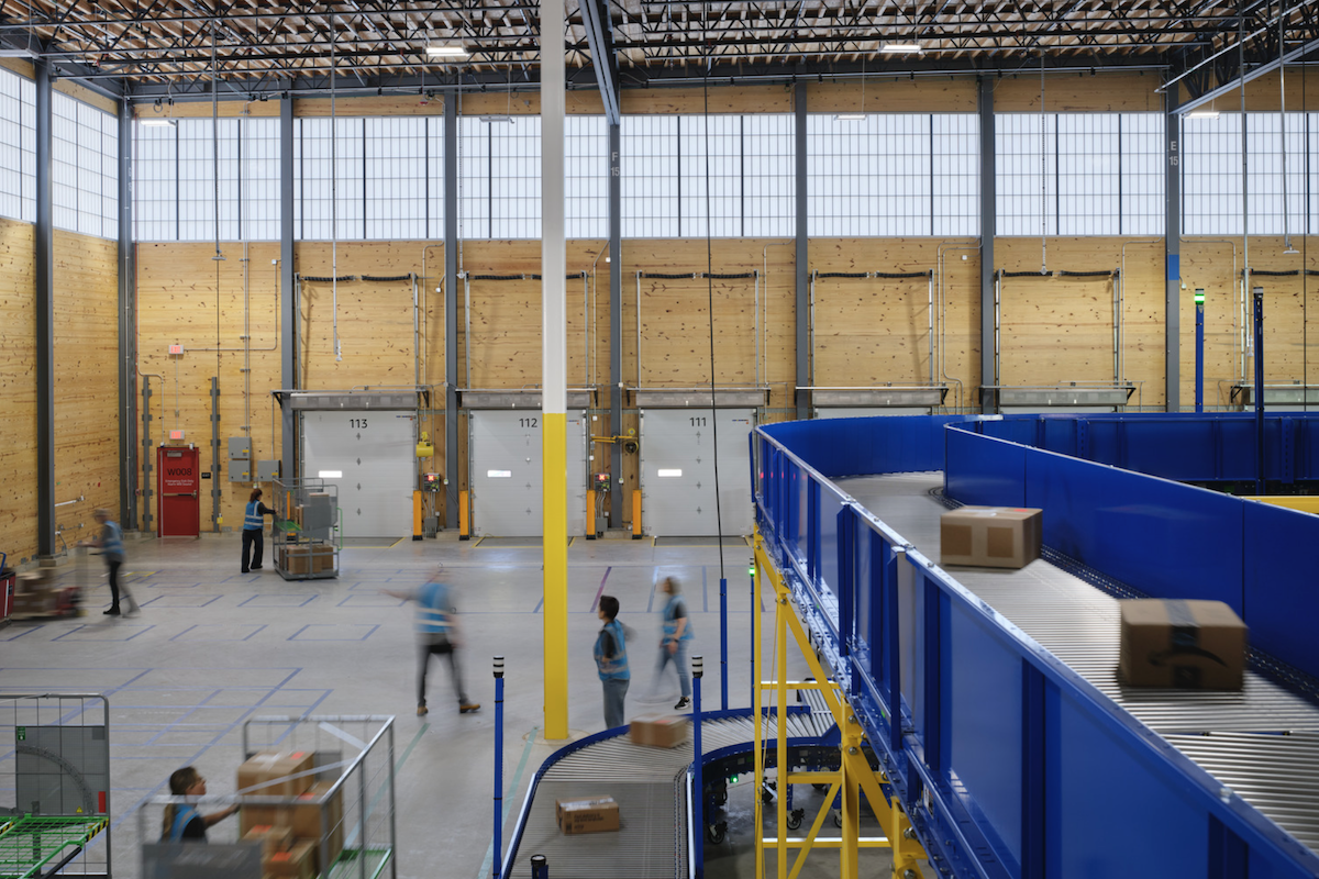 Located near the Elkhart Municipal Airport, the location will employ more than 200 Amazon and contract employees, handling local fulfillment, according to an Amazon spokesperson. The building also features employee-centered wellness designs such as day- and night-shift-optimized lighting and low-emitting, bio-based interiors.