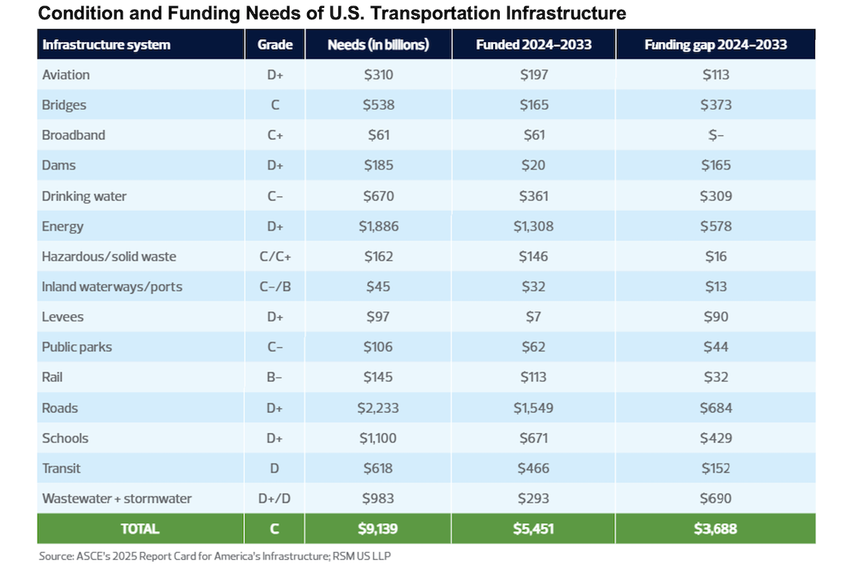 ASCE evaluated 18 infrastructure categories based on factors such as current and future capacity, physical condition, funding levels and gaps, regulatory compliance, public safety, resilience, and innovation. The findings paint a picture of strained systems, aging assets, and limited investment. The organization estimates a funding gap totaling $3.7 trillion from 2024 to 2033 if federal funding remains flat.